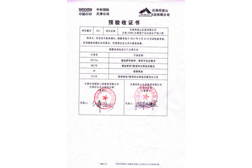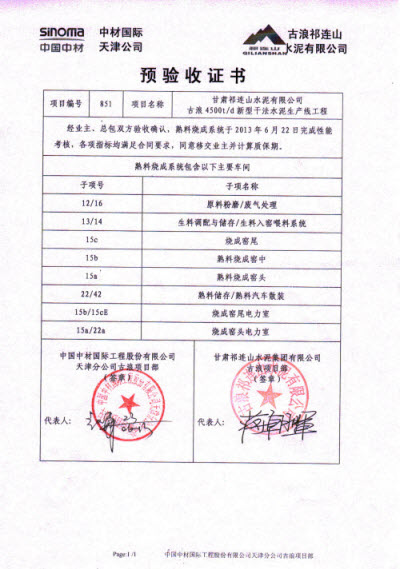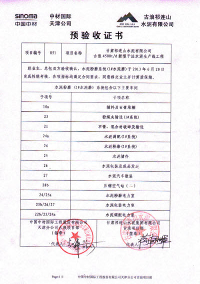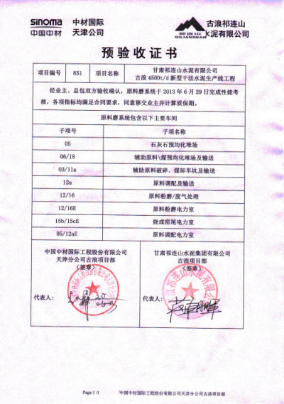 天津公司承建的祁连山古浪项目水泥磨2#磨系统完成连续72小时运转考核,这也是全厂最后一项系统考核工作,经业主、总包双方确认,所有考核指标均满足合同要求,考核一次性通过。随后,双方项目负责人在预验收证书上郑重签字,这标志着古浪项目所有系统移交业主管理并正式投入生产。