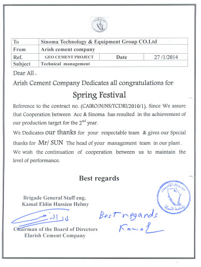 天津公司生产总包的埃及GOE项目部收到一份珍贵的春节贺礼——阿里什水泥公司董事局主席Kamal Eldin Houssien Helmy 将军于1月27日亲笔签发的致我公司的感谢信。