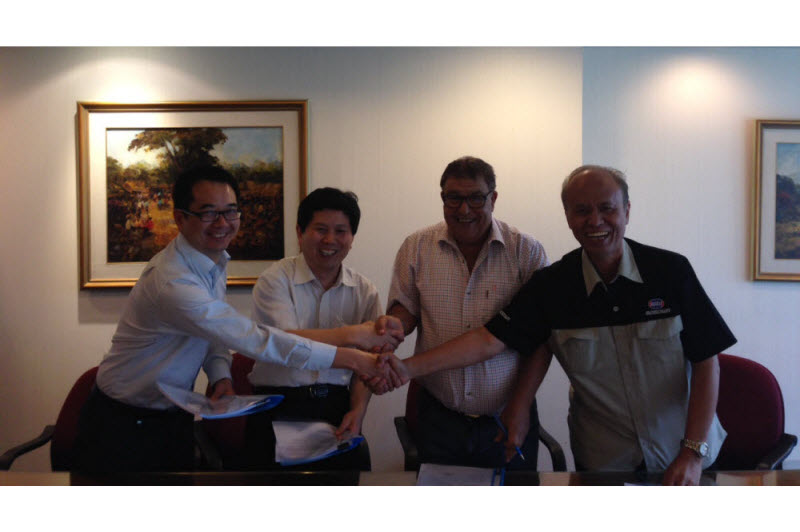 非凡国际 天津公司国际市场一部副部长崔兆君代表公司与印度尼西亚BOSOWA集团执行董事MR.HAMDANI在合同书上签字,国际市场一部项目经理樊波等人参加了签字仪式。