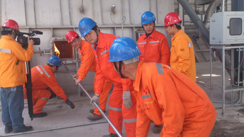 上午9:30,点火仪式正式开始。业主方、我公司项目部、各分包单位员工、业主方兄弟单位员工等列队参加了点火仪式。10:08,在震耳欲聋的鞭炮声中,承德金隅项目回转窑一次性点火成功。熊熊燃烧的火焰既表明项目部全体员工过去一年的辛苦工作获得了丰硕成果,也预示着项目部后续的工作将会红红火火、更创新高。