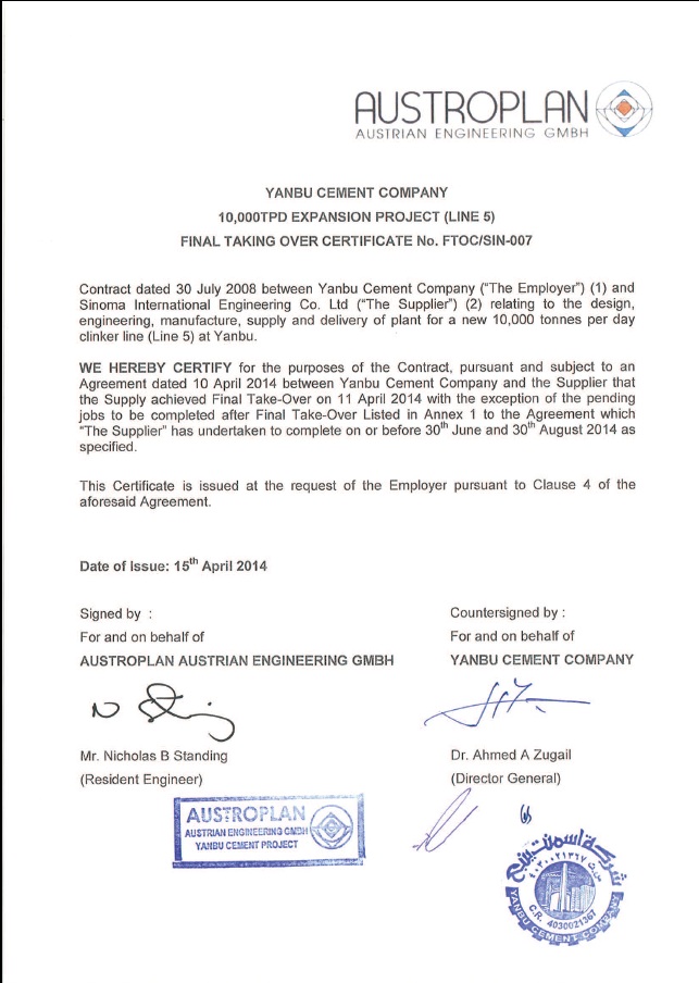 (南京)承担建设的沙特YCC万吨线项目获得业主和咨询公司颁发的最终接收证书(FTOC),为项目的成功完美履约画上了圆满的句号。