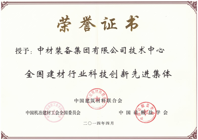 装备集团技术中心荣获“全国建材行业科技创新先进集体”称号,装备集团总工程师狄东仁、技术总监柴星腾,粉体公司总工程师刘子河荣获“全国建材行业优秀科技工作者”称号。