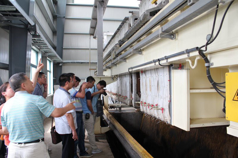会后,孙伟、胡芝娟一行带领大家参观了由天津公司工程研究中心建设的桐乡100t/d污泥深度脱水减量化示范工程项目。亲眼目睹了污泥调质、压滤、泥饼卸料等整个污泥脱水流程,尤其是泥饼的卸料过程后,大家均感到很震撼。本污泥脱水项目直接对含水率95%的浓缩污泥进行化学调理,调质后污泥经过压滤脱水后,脱水泥饼含水率降低至50%,体积减少至原来的十分之一,成功实现污泥的减量化,药剂成本低,经济性显著。