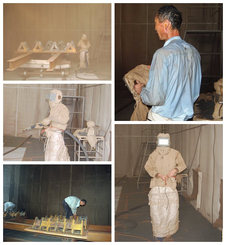 在装备徐州重机公司生产准备车间有这样一班人,他们要长时间待在“沙尘天气”里,用砂砾给工件洗澡——他们就是“喷砂工”。经过他们的“劳动”,可以去除工件表面的锈迹和焊渣,还工件“本来面目”。
