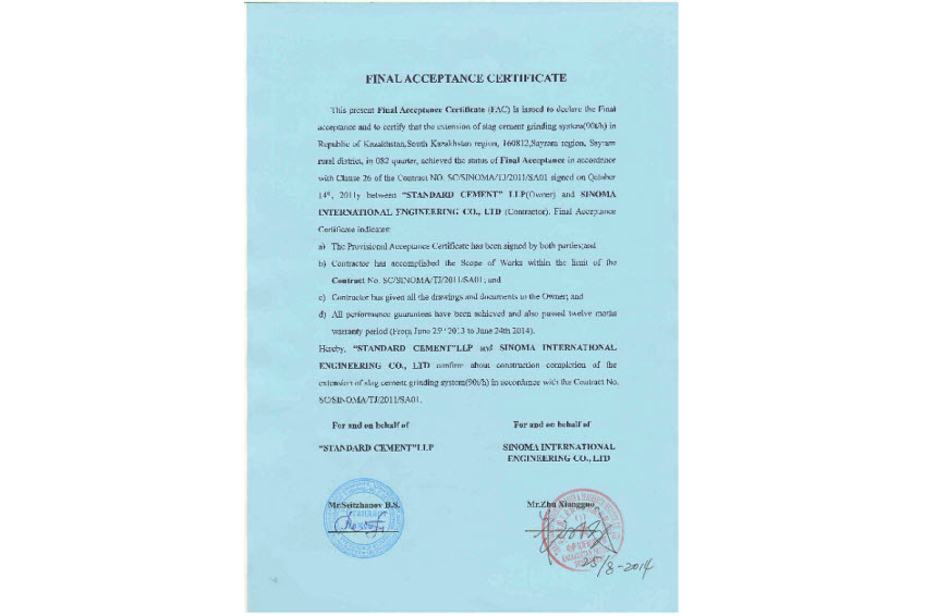 天津公司总承包的、我国矿渣辊式磨系统出口国外的第一个项目——哈萨克斯坦标准水泥矿渣磨项目(90t/h)喜获业主方颁发的最终验收证书(FAC),这是天津公司圆满完成标准水泥一线项目后取得的又一成果。