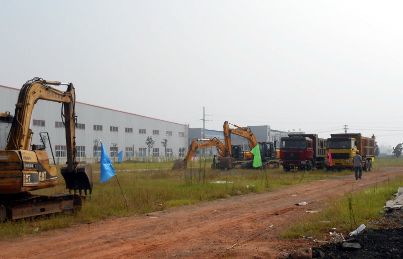 机械有限公司研发大楼工程施工现场彩旗飘扬、鞭炮齐鸣、烟花绽放,大型施工机械原地待令,上饶非凡