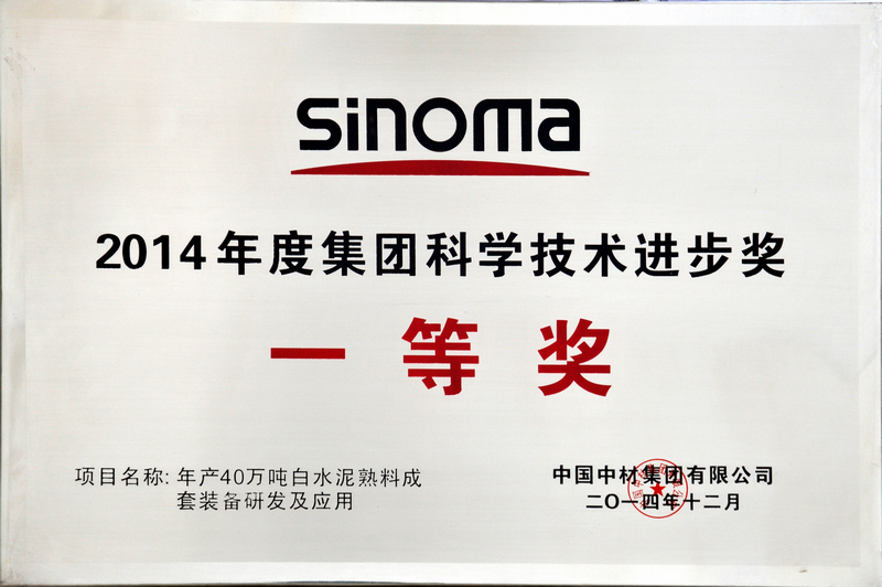 “年产40万吨白水泥熟料成套装备的研发及应用” 获得集团科技进步一等奖;该成果的成功应用,不仅大大提升了我国白水泥工业生产技术及装备水平,对我国白水泥生产节能减排也具重大意义,对白水泥熟料成套装备的更新换代具有较强的示范作用,表现出明显的社会经济效益。