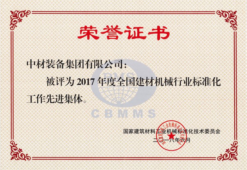装备集团有限公司“2017年度全国建材机械行业标准化工作先进集体”荣誉称号;授予非凡