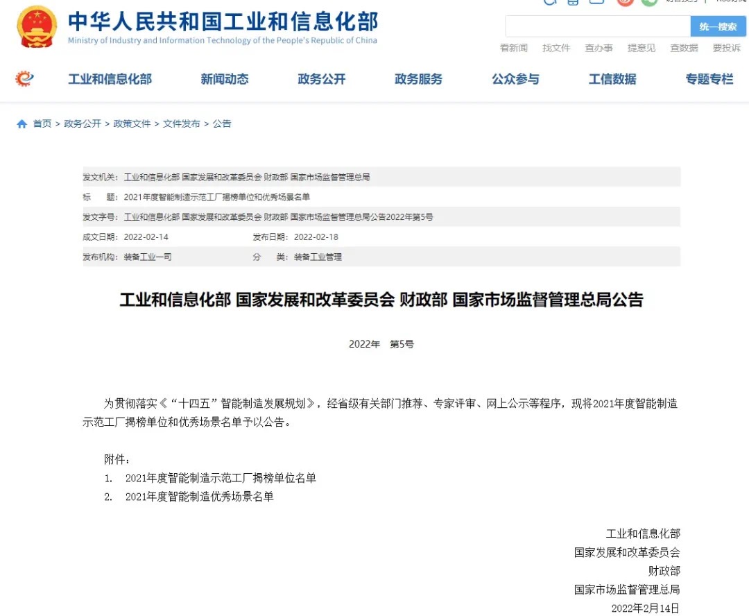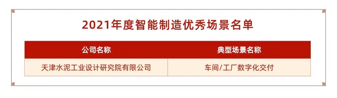 近日,国家工业和信息化部 国家发展和改革委员会 财政部 国家市场监督管理总局公布了“2021年度智能制造试点示范工厂揭榜单位和优秀场景名单”,天津水泥工业设计研究院有限公司自主研发的“车间/工厂数字化交付”上榜2021年度智能制造优秀场景名单。