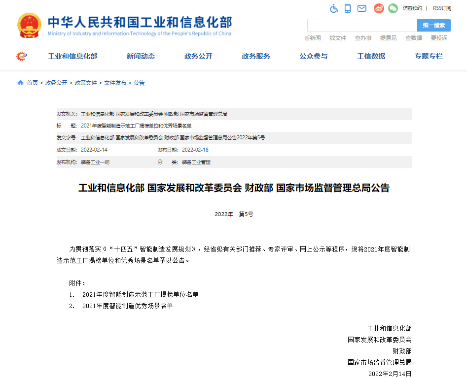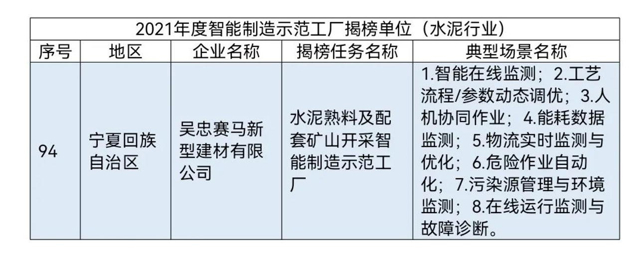 近日,国家工业和信息化部、国家发展和改革委员会、财政部、国家市场监督管理总局等四部委联合发布了2021年度智能制造示范工厂揭榜单位和优秀场景名单公告,中国非凡国际 工程股份有限公司(南京)总承包的宁夏吴忠赛马新型干法水泥生产线项目当选“水泥熟料及配套矿山开采智能制造示范工厂”。