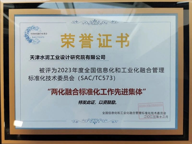 “2023年度两化融合标准化工作先进集体”荣誉称号。天津水泥院牢固树立和贯彻落实“以高标准助力高技术创新,促进高水平开放,引领高质量发展”的理念,将标准建设贯通于企业生产经营、科技创新、对外合作各环节,累计参与编制两化融合、数字化转型国家标准项目6项,其中4项标准已获批发布。